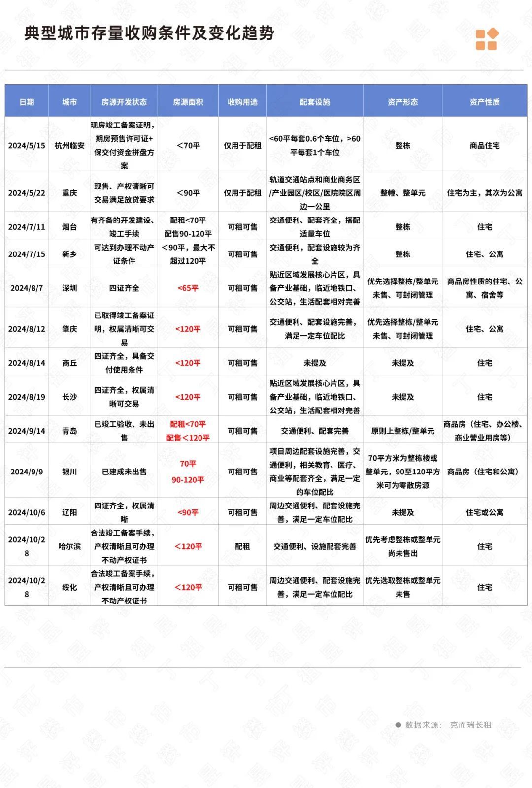 到了8月份以后关连计谋彰着发生了变化。各城市出台的收购详情在房源禀赋、面积、性质等方面均进行了优化,宽绰略求开发情状为四证都全,收购面积扩大到了120㎡且可同期用于租和售,同期财富性质放宽至公寓、寝室、办公楼、买卖营业用房等。