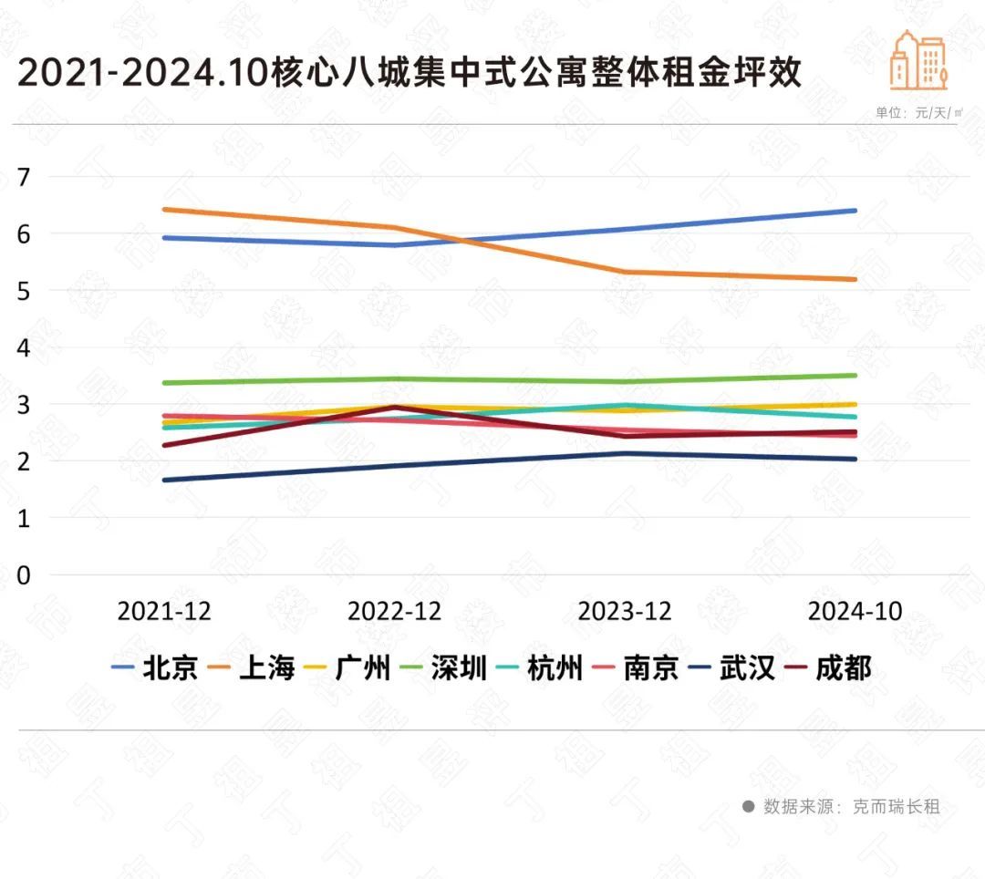 房钱坪效方面,多城市处于相对踏实趋势,2024年10月末中枢八城聚拢式公寓举座房钱坪效平均为3.48元/天/㎡,较客岁底微增0.3%。其中,北京房钱坪效最高,达到了6.4元/天/㎡。