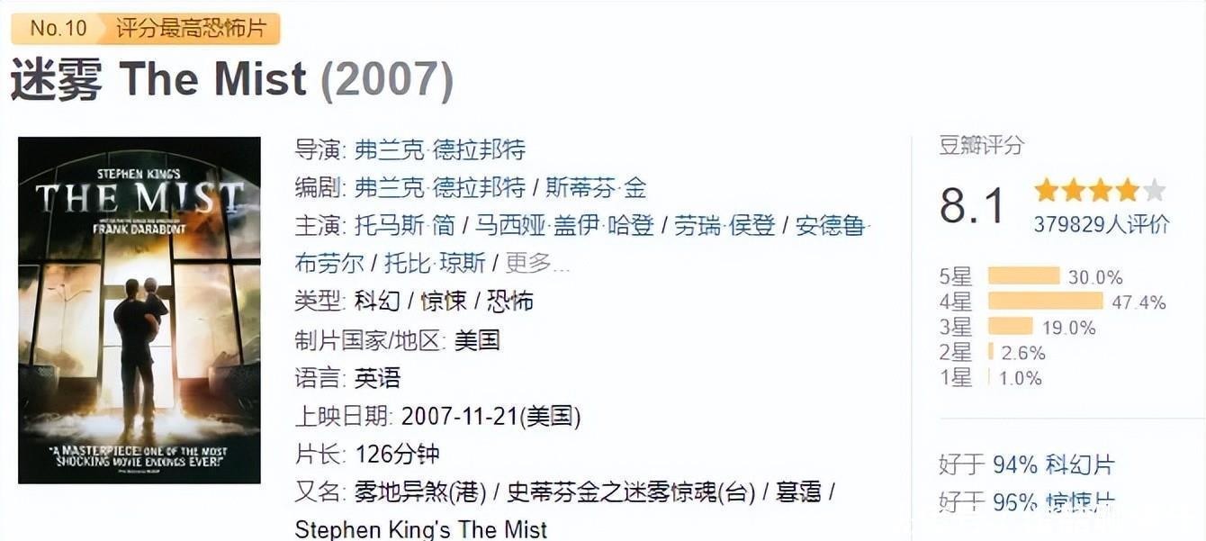 此外,《绿里古迹》和《迷雾》这些电影亦然评价不低,其中《迷雾》若是你肃肃看下去的,扫尾会给你一个大大的惊吓!