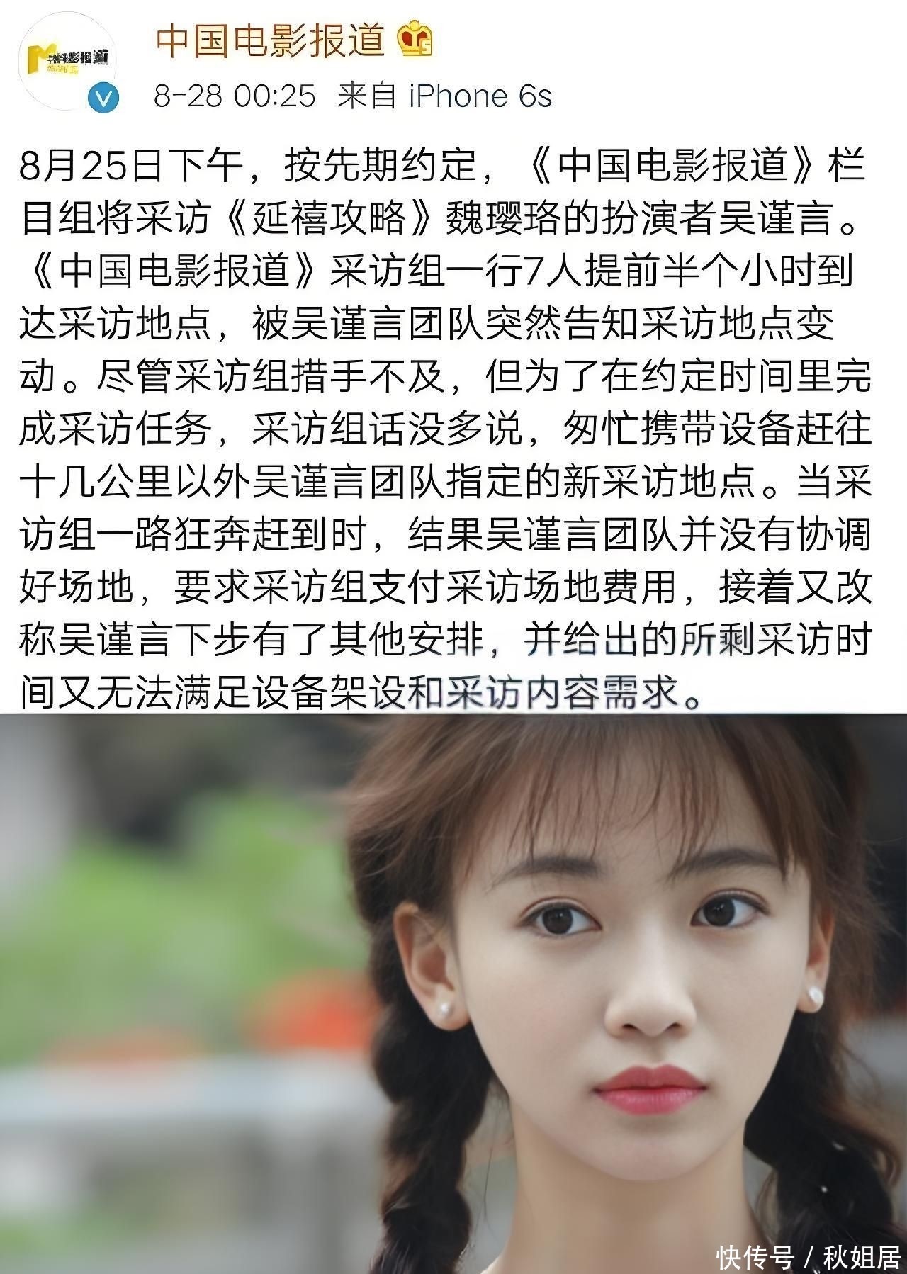央视电影频说念底本安排了一次采访,两边依然证明了时代与方位。但当责任主说念主员准时到达现场时,吴谨言团队遽然建议更换形势的条目。