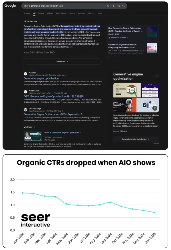 纠合客户的反映,再看这里开释出来的数据,AI径直给出谜底正在导致SEO点击率断崖式下落: