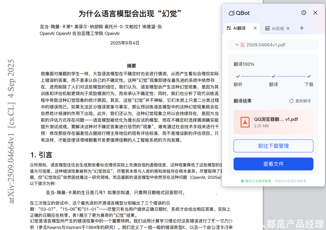 比如这篇论文《Why Language Models Hallucinate》,统共有36页,不错径直用AI小窗开启翻译(总结):