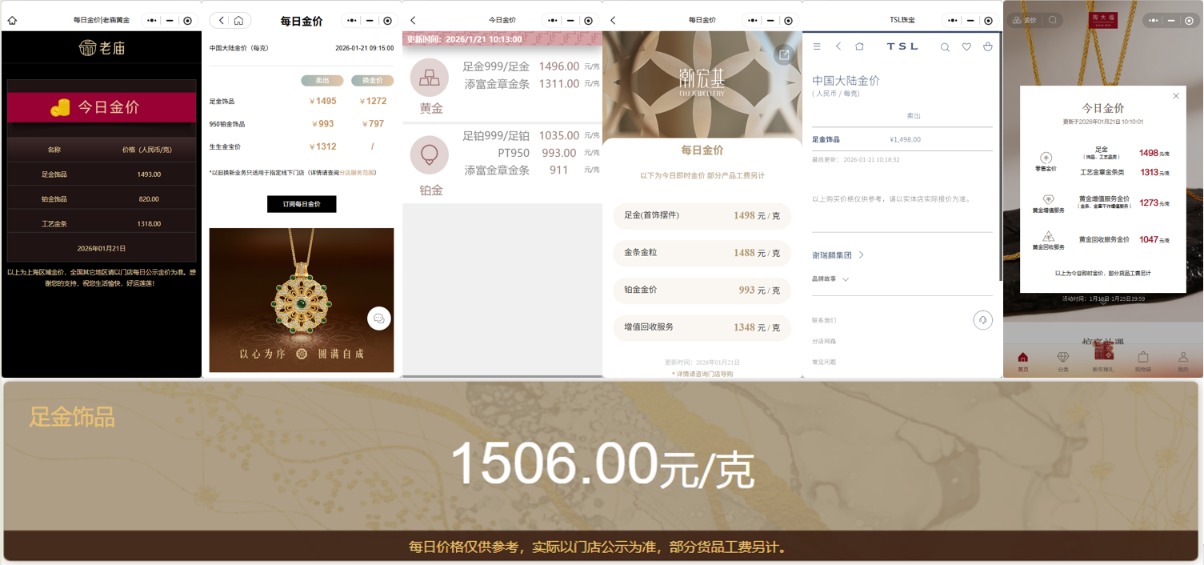 上证报中国证券网讯(记者曾庆怡)1月21日上昼,追随海外金价历史性地龙套4800好意思元/盎司关隘,多家黄金珠宝品牌公布的境内足金饰品价钱大宗较前一日大幅上调,较高者已龙套1500元/克关隘。